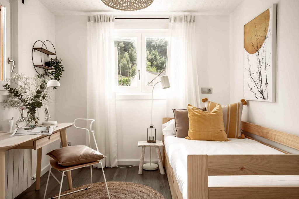 La maison présente des touches décoratives un peu plus industrielles, qui contrastent avec l’architecture méditerranéenne classique de la maison. Dans une des pièces secondaires à côté du salon, nous avons utilisé un de nos canapés-lits LORE avec lit gigogne, glissé juste en-dessous. associé à un petit bureau en bois, pour utiliser cet espace à la fois comme bureau et comme chambre d’amis. Pratique et fonctionnel !
