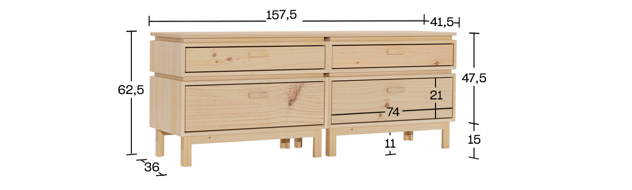 Commode double avec 4 tiroirs avec pieds 157x62 AIKA | LUFE