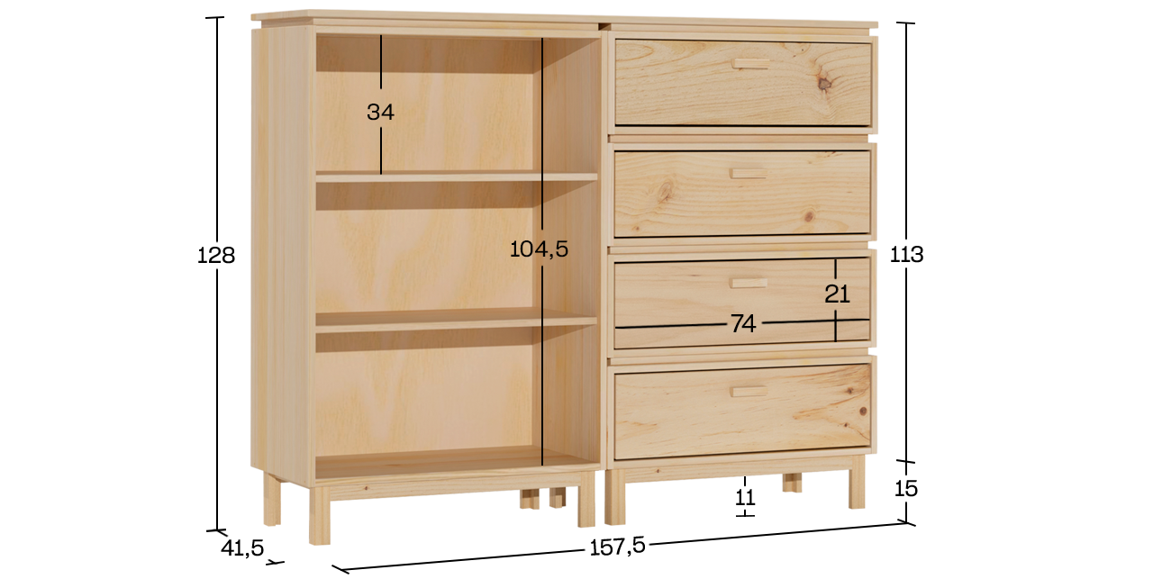 Étagère en bois naturel écologique avec quatre tiroirs de rangement intégrés. Un meuble alliant fonctionnalité et design, conçu pour s'adapter à différents espaces de votre maison. Fabriquée en bois écologique, elle permet une organisation et un rangement efficaces.