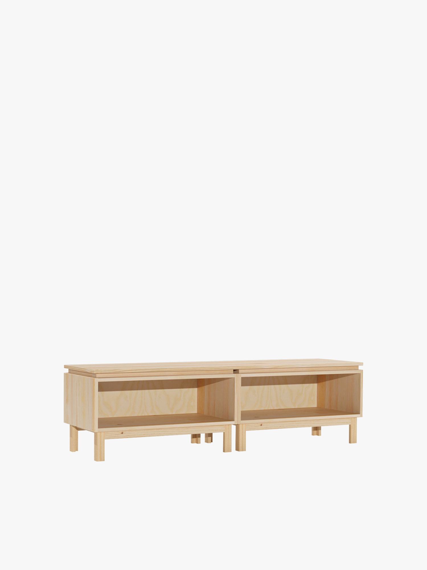 Meuble TV bas en bois écologique et naturel, doté d'un grand plateau et de deux espaces de rangement pour boîtes ou paniers. Ce meuble allie fonctionnalité et design pour s'adapter à différents espaces de votre maison. Fabriqué en bois écologique certifié, il permet une organisation et un rangement efficaces, tout en conservant un style frais et intemporel.
