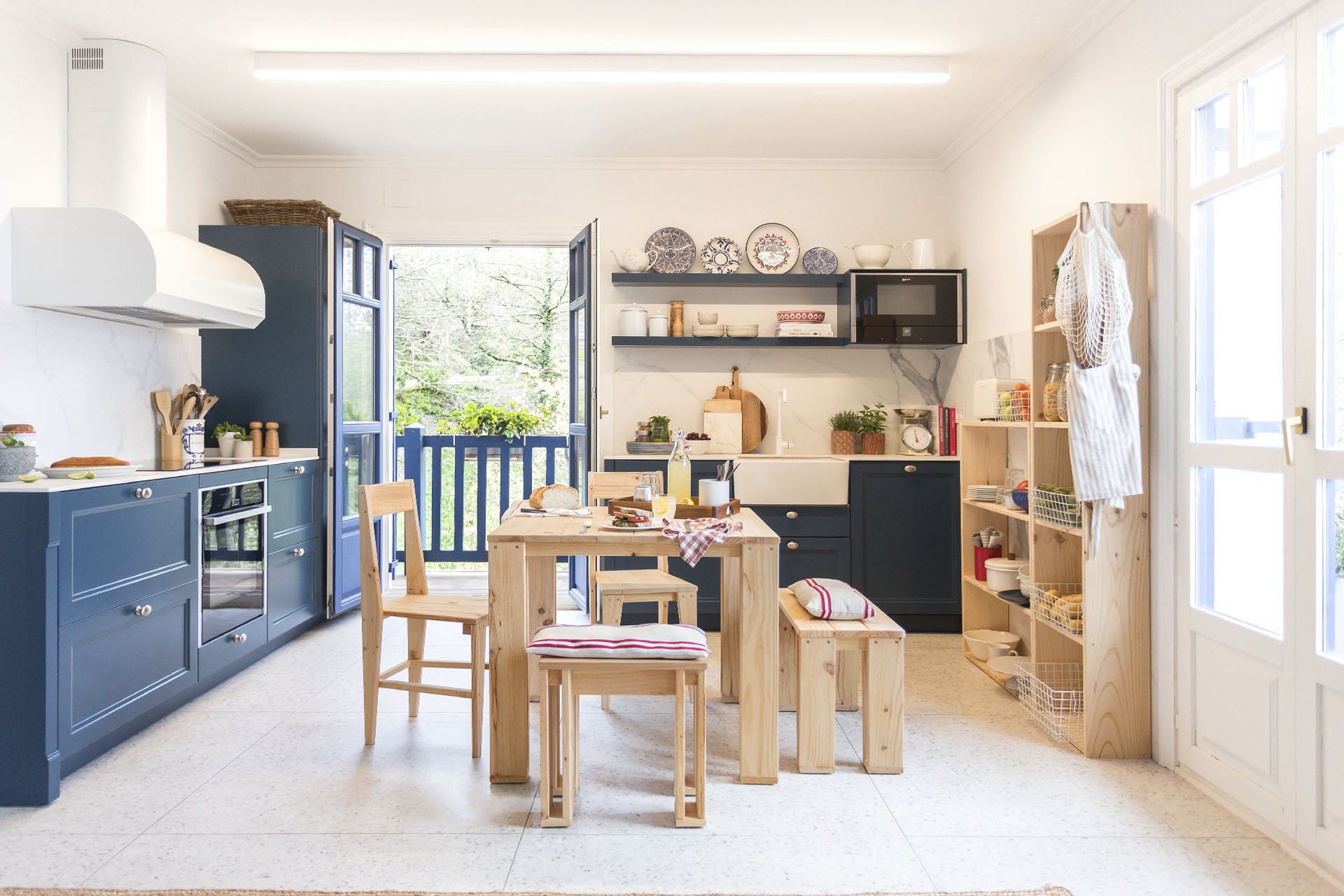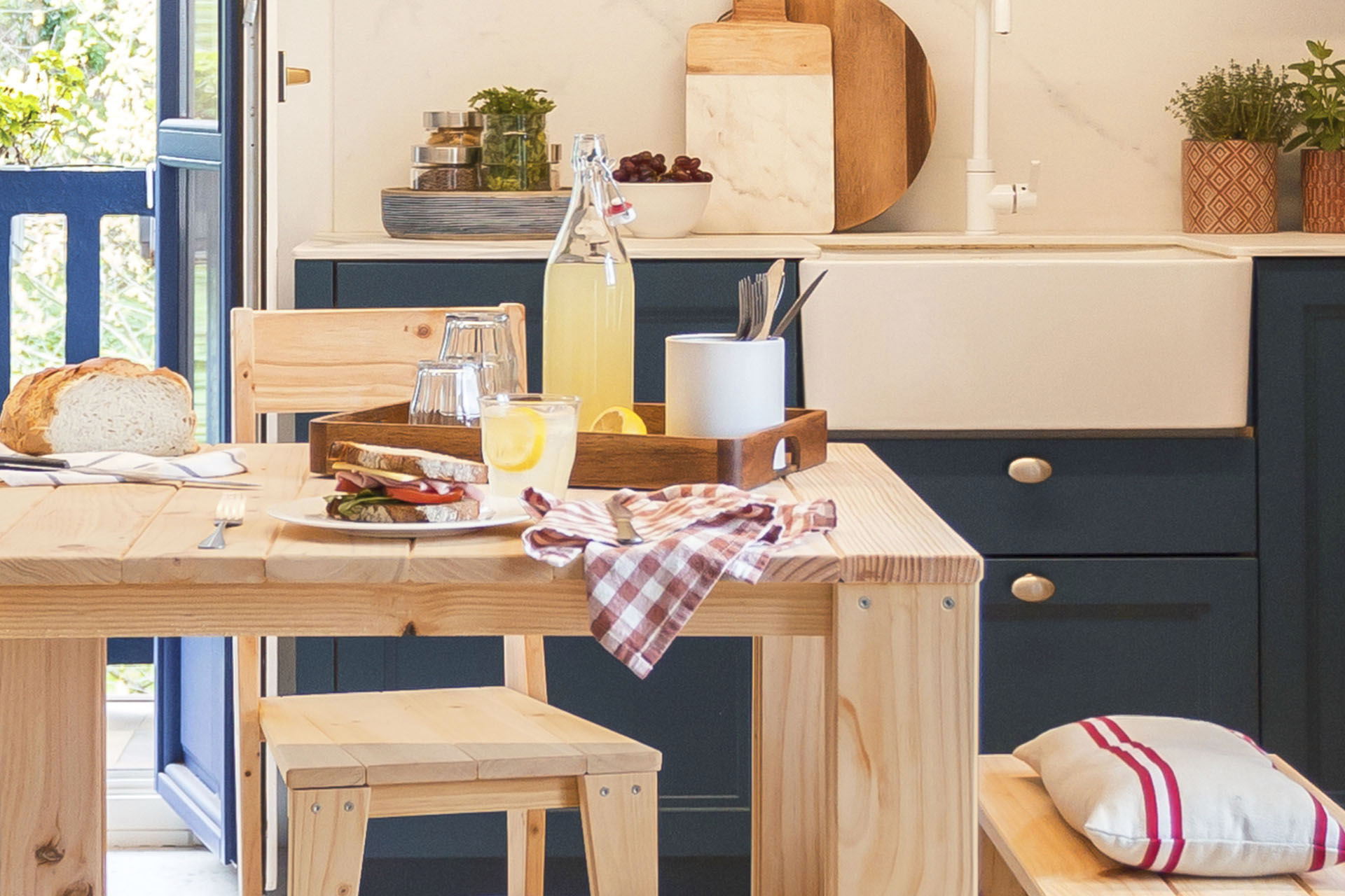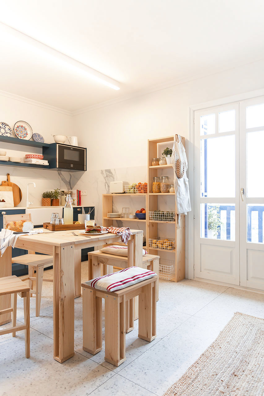Ensemble de table de 80x80 cm avec bancs en bois naturel. Un ensemble très pratique pour décorer les cuisines, les salles à manger et les petites terrasses.