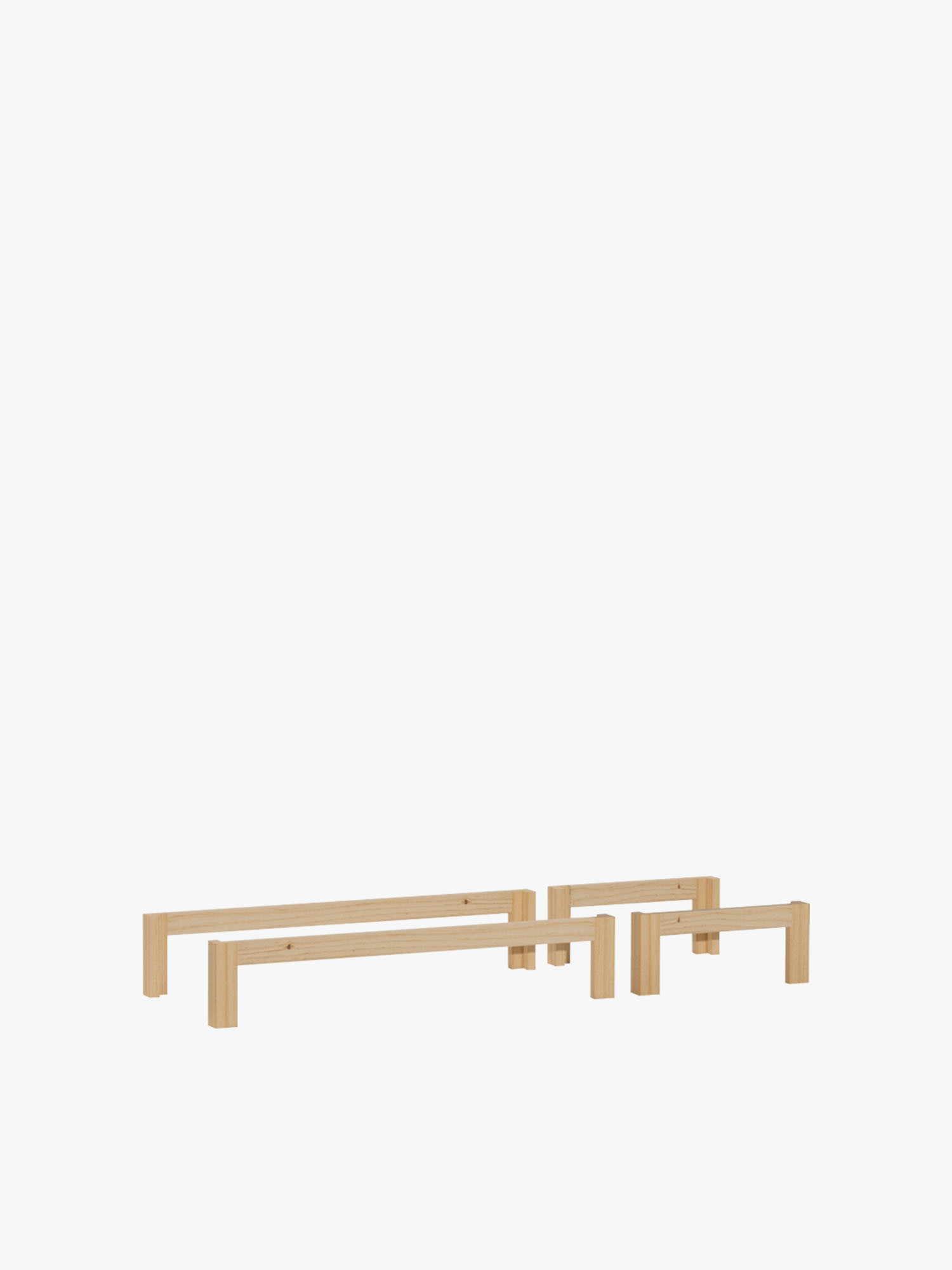 Pack de quatre pieds en bois massif naturel pour des combinaisons modulaires de 117 cm, telles que des commodes, vitrines, meubles TV, buffets salon, placards ou armoires doubles, composées d’un module de 78 cm et d’un module de 39 cm.