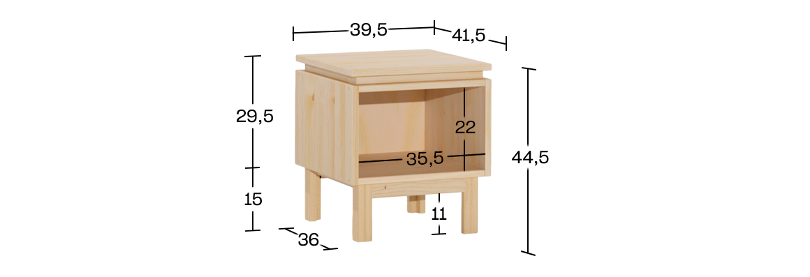 Table de chevet modulaire en bois de pin massif et naturel, avec espace ouvert et pieds. Idéale pour les lits bas, les chambres d'enfants ou les espaces réduits. Fabriquée à partir de bois local certifié, dans le style simple et naturel de LUFE.