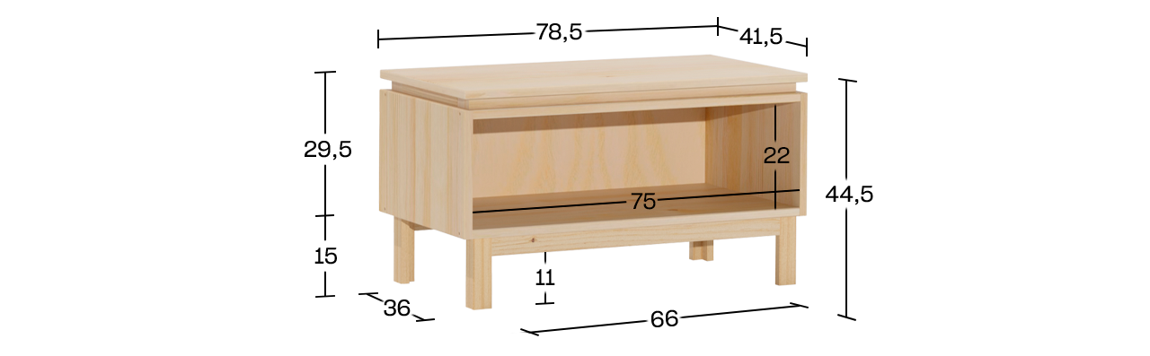 Table de chevet basse en pin massif naturel, avec un creux ouvert et des pieds qui apportent une touche de légèreté. Idéale pour les lits bas, les chambres d'enfants ou les petits espaces. Fabriquée en bois local certifié, le style simple et naturel de LUFE.