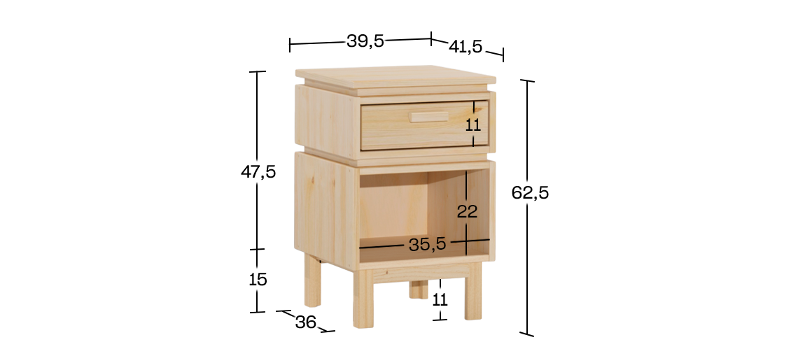 Table de chevet en bois de pin massif et naturel, avec un tiroir supérieur et un espace de rangement inférieur offrant une double fonctionnalité. Parfaite pour maintenir l'ordre dans les chambres d'enfants, d'adolescents ou doubles. Fabriquée à partir de bois local et certifié.