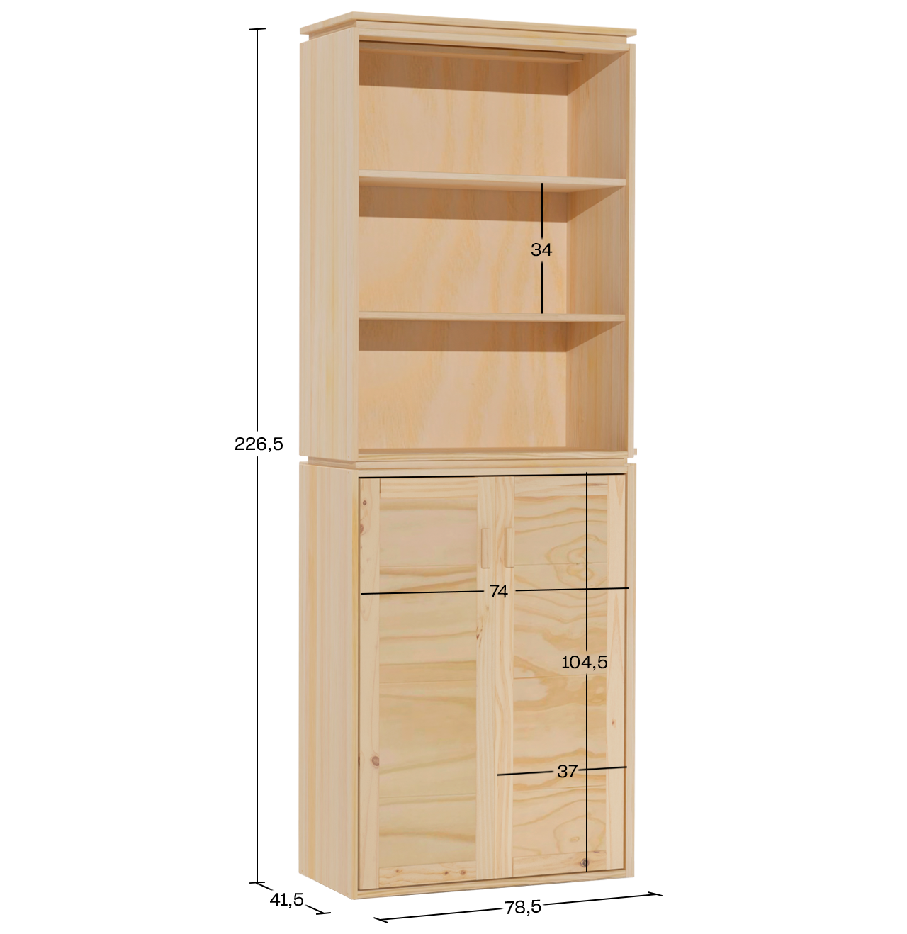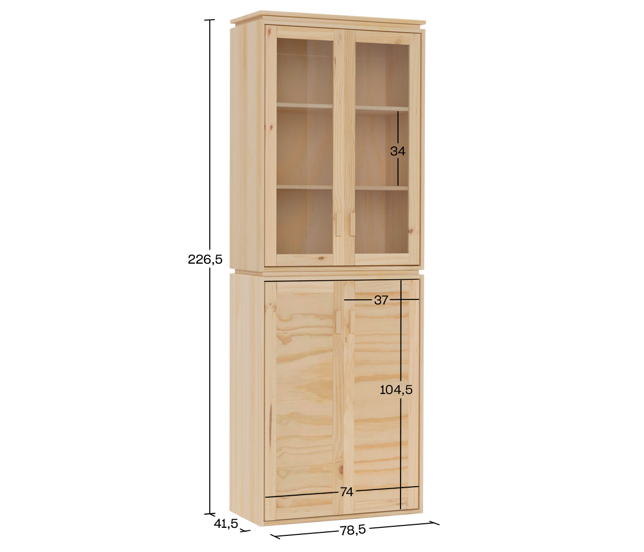 Vitrine placard en pin massif naturel avec des portes vitrées en haut et une armoire fermée en bas. Son design nordique et intemporel en fait un meuble fonctionnel et élégant pour la cuisine, la salle à manger ou le bureau. Fabriquée avec du bois local et certifié dans notre usine du Pays Basque espagnol.